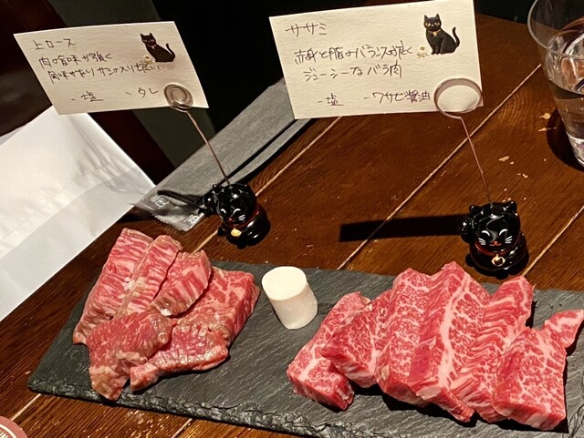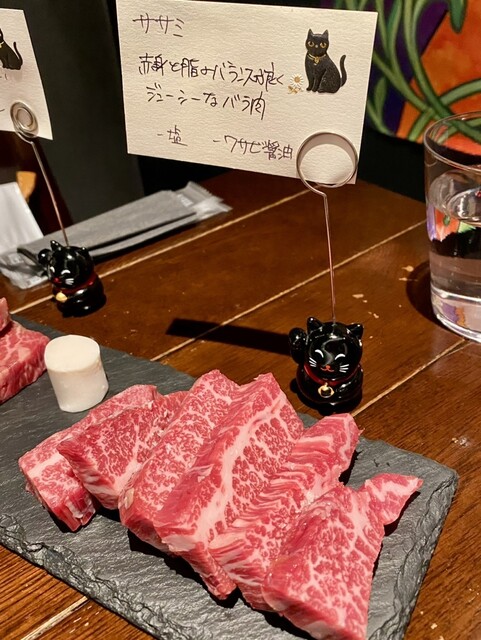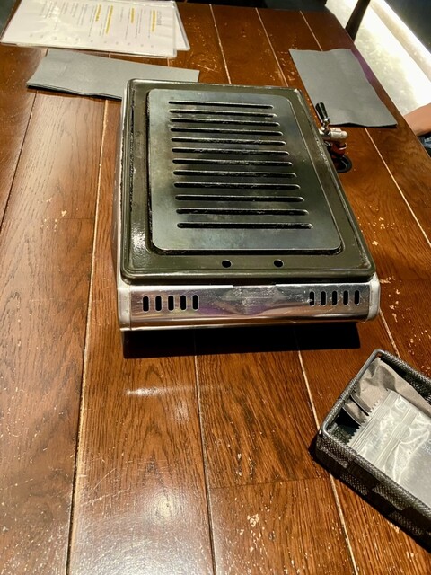 「カットレモン」「ワサビ」「醤油」「白と黒の2種類の塩」「焼肉ダレ」がテーブルに配置されたところで、お馴染みの焼肉スタイルであることが判明。