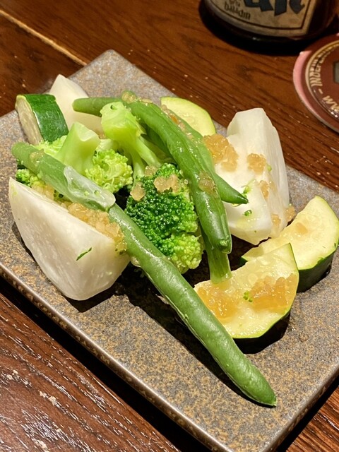茹で野菜も綺麗に盛り付けられて、柑橘系のドレッシングが良い感じ。
