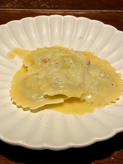 ラビオリも同様の綺麗な盛り付けで、ラビオリの中に閉じ込められたリコッタチーズは、すり潰したポテサラのような舌触りでクリーミー。