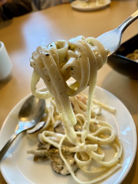 「エビときのこのクリームパスタ」は平打ち麺にキノコの風味が絡まっていてこれも美味い!