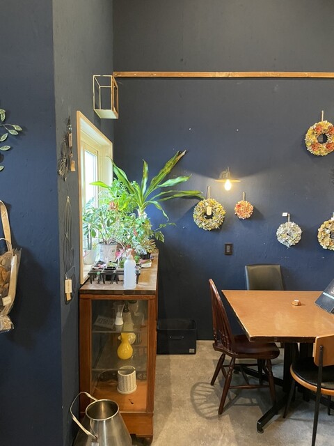 店内はウッド風で花が良い感じに飾られている