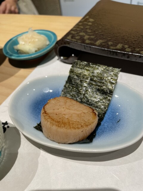 焼きたての帆立を海苔を巻いて