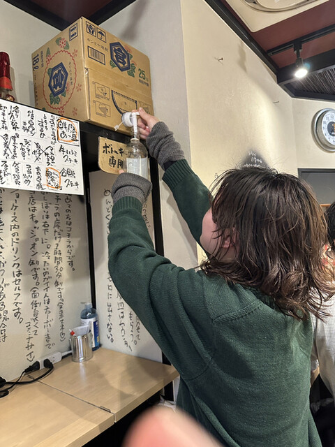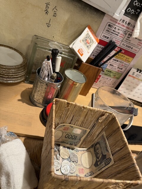 一年ぶりくらいかな?ツマミや酒が届いたら、小銭の入っている箱に自分でお金を投入し、お釣りをもらっていくスタイルです。新規客が最初の一杯を飲む時は、客と店員全員で乾杯!