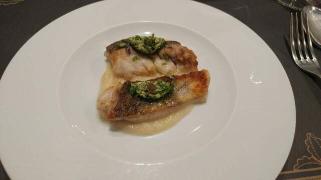 魚料理はマダラのポワレをチョイス。上に乗っているのはシェルの自宅で採れた木の実を使ったバターとのこと。野性味と繊細な調理が合わさって記憶に残る一品となった。