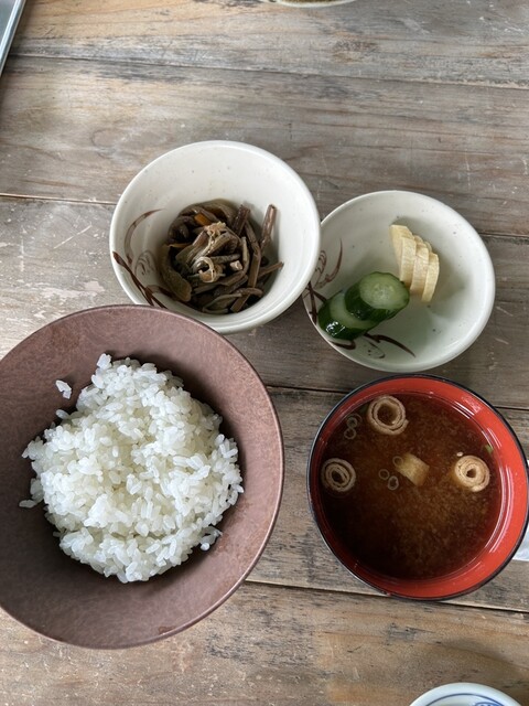 8月23日(金)の13時20分に到着しましたが、駐車場はほぼ満車でしたがかろうじて停めることができました。4人です訪問したので焼き魚(岩魚と鮎を2尾ずつ)とランチセットに加え、ゆば刺し、いわな刺し、川えびの唐揚げ、黒板に書いてあった岩魚の天ぷら盛り合わせを注文しました。やや暑かったですが外の席で美味しくいただきました。