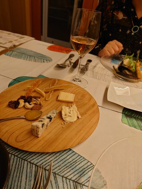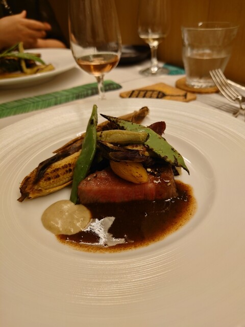 メインのお魚はフグを使ったテリーヌ風でお野菜に隠れた宝探しを楽しめまして。お肉料理は妻は短角牛ハンバーグ、自分は黒豚ローストをお願いして分け分け。黒豚は柔らかくてふかふか、ハンバーグはジューシーで最高のうまさ!これまたロゼや赤ワインと合わせて美味なる時間を。