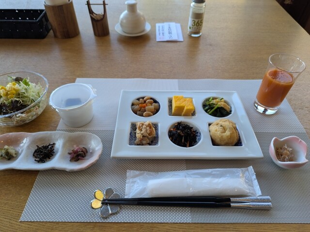 朝ごはんは地の物を使った体に優しいお料理で、卵焼き/干物(鯖ミリン干し/小鯵/サバのハーブ漬)/ガンモドキに加えて野菜たっぷりの味噌汁に白米(つや姫)を、これまた朝日を部屋の中で浴びながらいただきました。