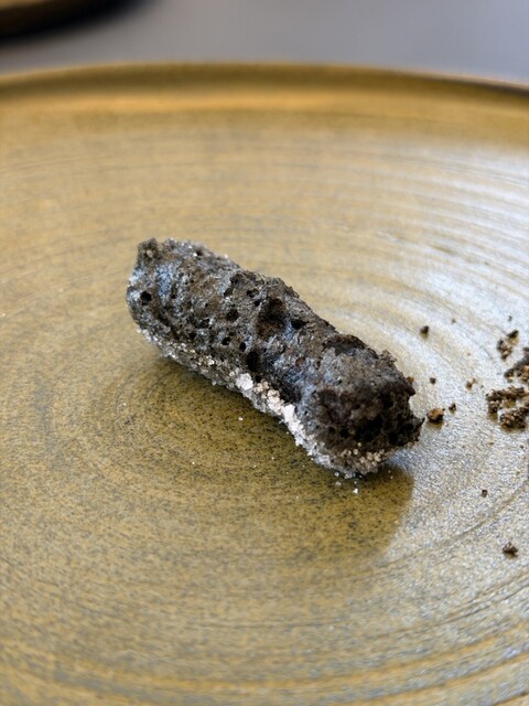 端の焦げた部分は炭パウダーとして衣に使用しています。
