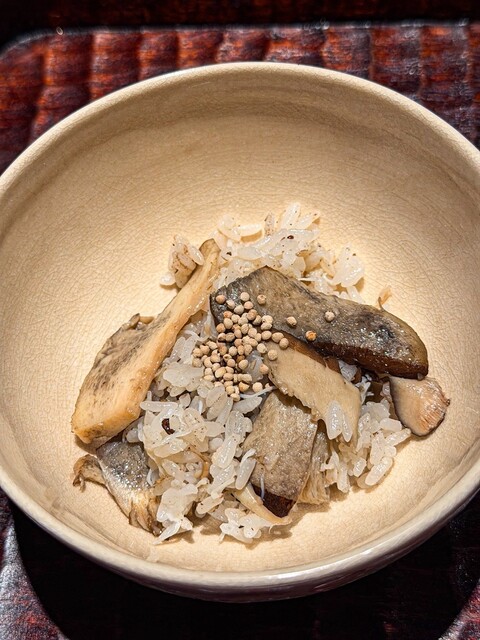 薪で火入れをして上からは発酵させた椎茸のソースを使っています。