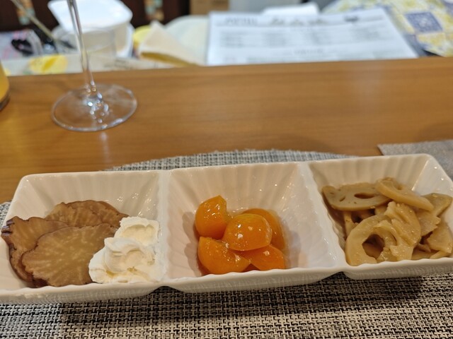 いぶりがっこチーズ、金柑、れんこんきんぴら