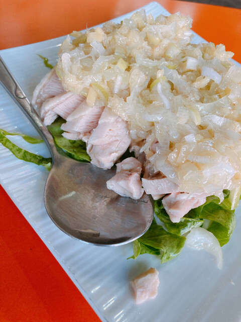 名物の蒸し鶏はたっぷりのネギの中に隠れているスープの煮こごりが美味しさの決め手、餃子はジューシーで肉汁がドバッと、ニラも効いています。