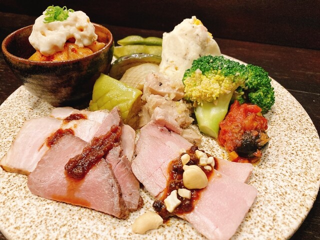 本日のお肉達とご対面タイム、盛り上がるなぁ…赤ワインも追加で。サービスいただいた白身魚の昆布和えも白ワインに合いますね。芋焼酎ベニハルカのロックを追加…早すぎ…汗