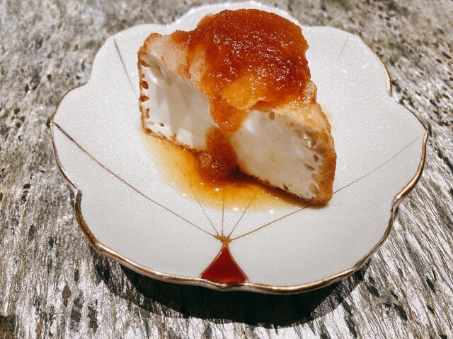 柿とクリームチーズを生ハムで、キャビアと金粉も載ってる〜♡