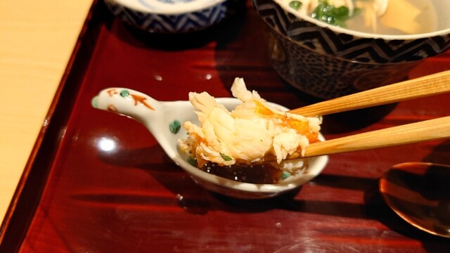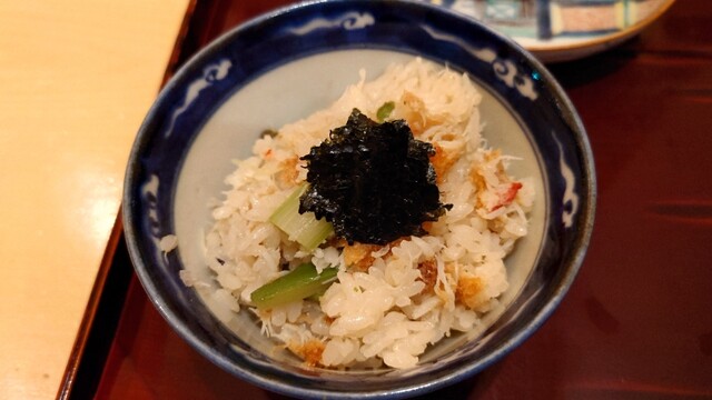大原女が頭に乗せて京まで売りに来た柴を模して、筍に干しぜんまい、湯葉を干瓢で巻いたものを具にしてます。干瓢を解いてからどうぞ。ということで、染み入るお出汁に山菜が美味しいねえ。