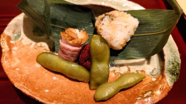 (奥のお猪口)飛騨牛のタルタルステーキ、(鬼灯の中)山桃の赤ワイン漬、(栄螺の形の器)毛蟹の胡麻汚し 下に焼き茄子、枝豆、三度豆