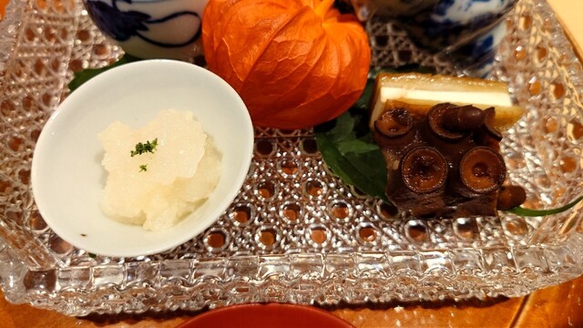 ・(左下のお猪口)鱧子(鱧の卵)の塩辛と烏賊を和えたもの