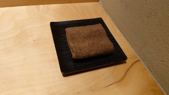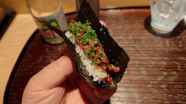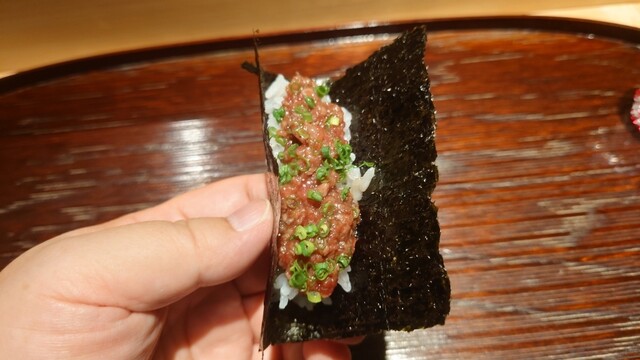 続くカイノミの手巻もこちらのスペシャリテのようですね。薪焼きしたカイノミを叩いて黒トリュフを混ぜたものを手巻き寿司にしたもの。合わせたタレに脂の甘味と肉の旨味の相乗効果で旨ッ!