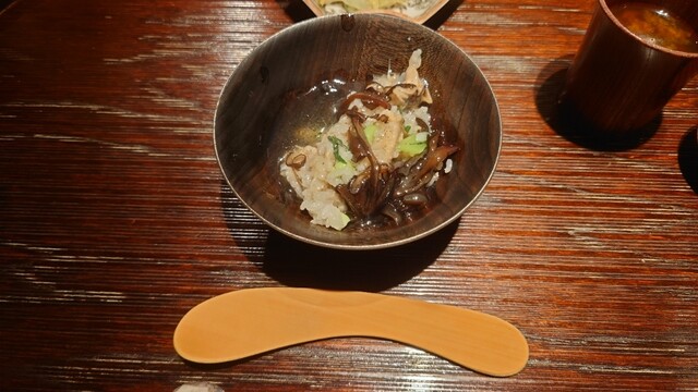 鶏節の出汁で炊いた聖護院かぶらを戴いてほっこりしたあと、薪焼き松茸ご飯でお食事。香の物となめこの赤出汁が付きます。太白胡麻油を塗って薪で焼いたことで松茸自身の香りに芳ばしさが加わって、とんでもなく美味しかった。