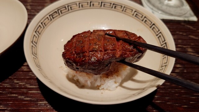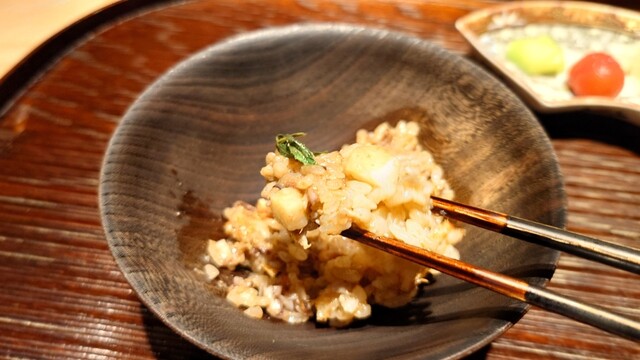 そして、これ目当てに来たと言っても過言ではない但馬太田牛ヒレ肉の飯蒸しが4品目に早くも登場。切れ目が入ってるけど、分厚いし一塊だし、箸だけで大丈夫かな?と思ってたけど、歯なんて要らない。唇だけで噛めちゃうような柔らかく、そして旨味のあるお肉で感動。和山椒の香りも良く、これを食べられただけでここに来た価値があったと思ったw