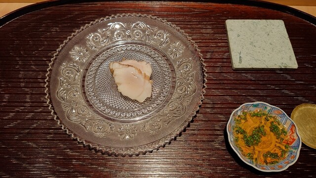 真鯛と雲丹のお造り 紹興酒で煮出した梅干しかキャビアで