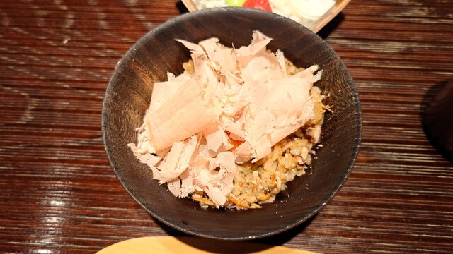 黄身と鰹節を乗せて