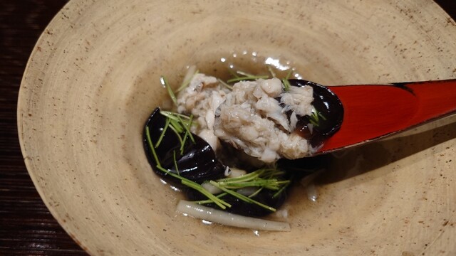 ・対馬の喉黒を薪焼きにして解したもの 浅蜊の出汁、薪焼きした木耳と芽葱の餡掛け