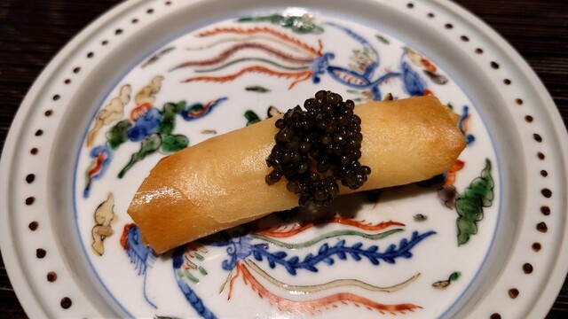・百合根の春巻 上に薪焼きしたキャビア