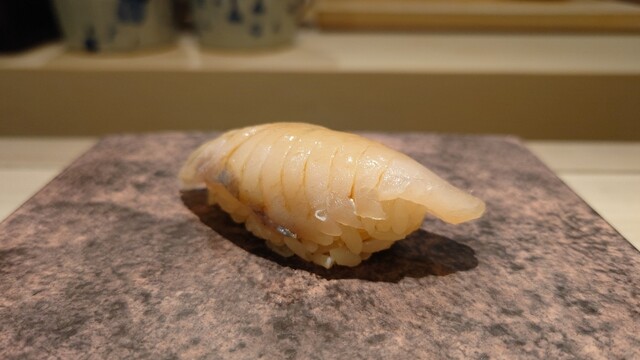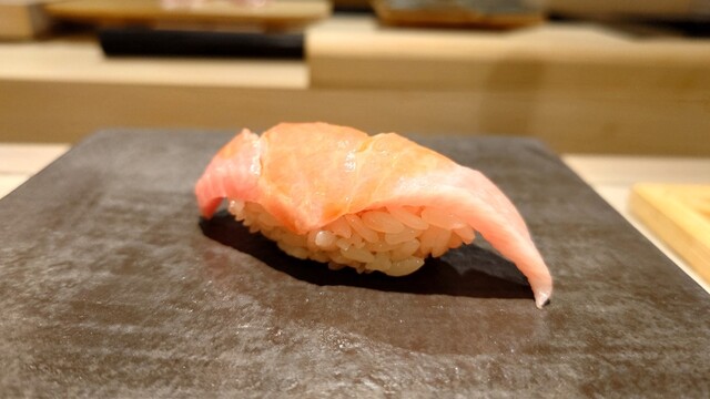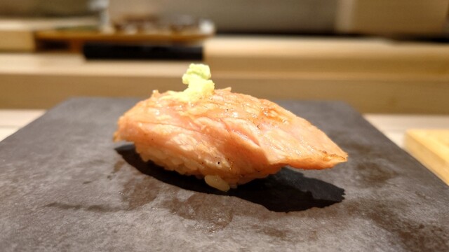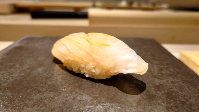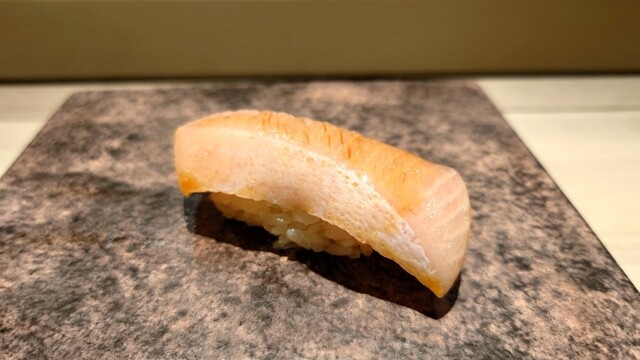 ・銚子の金目鯛 釣ったもの。こちらは浜から直接仕入れてるそうです。シャリとの間に葱を。金目鯛にしてはサッパリしてるけど、旨味が強くて美味しい!