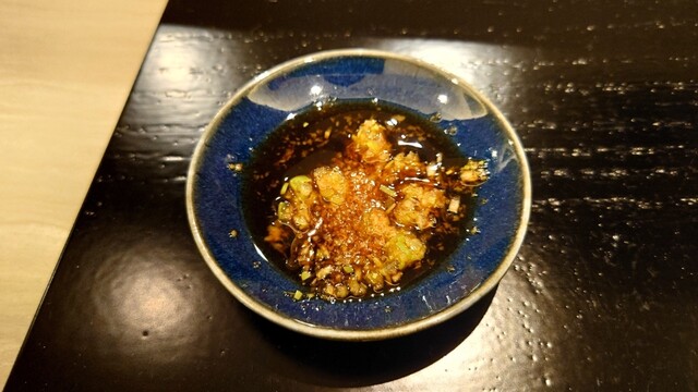 肝には一味。肝は摘みでも、肝を食べたあとに身を食べても面白い。