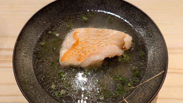 ・スギ 36℃/20℃ スギ?って初耳だったけど、黒カンパチとも言われる珍しい魚だそう。鳴門で捕れた7キロのいいのがあったので仕入れたとのこと。通常は沖縄辺りで捕れるらしい。昆布〆してるのもあって、旨味たっぷり!