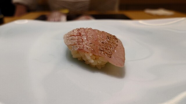 脂が乗ってるので、ご飯を大きめにブワーッと握ってるそうw 藁の香りが嫌いなので、ガスで匂いが付かない様に(この建物内では炭火が使えないので)皮目を炙ってるそう。