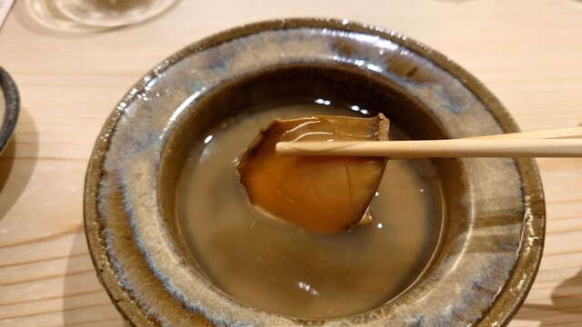 ・蒸し鮑 餡で。蝦夷鮑かな?小ぶりだけど柔らかく仕上がってて美味しい。