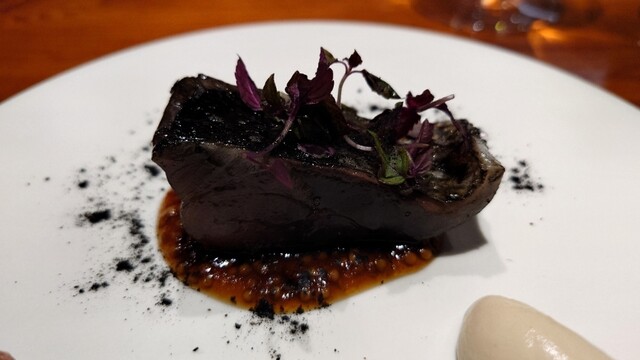 燻煙してるので表面は黒っぽくなってるけど、ナイフでカットすると中は生みたいに瑞々しい。口に入れると爽やかな脂と旨味が広がって、こりゃ美味しい!!一口ソースだけで戴いたあとは、フィンガーライムを絞って、そして焼き茄子のピューレを付けて戴いたけど、焼き茄子のピューレがまたこの鯖によく合って、美味しかった。