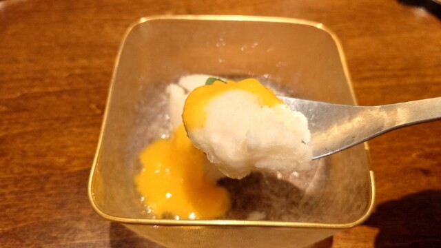 ・レモンシャーベット 下にミントのジュレ、上からマンゴーソース