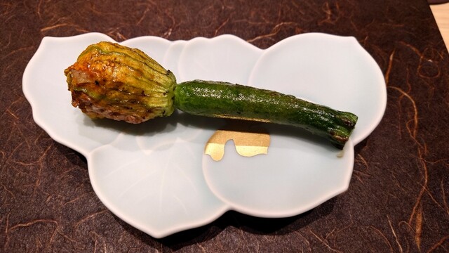今回の肉詰めは花ズッキーニかあ。なんかお洒落w 花の部分は熱いけど一口でとのことで…ハフハフ!