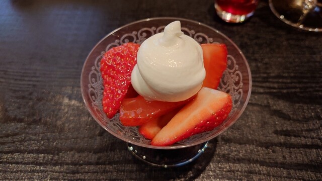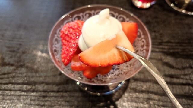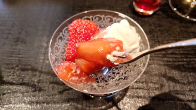 紅ほっぺは切っただけのものとシロップで瞬間コンポートしたものが用意されてます。シロップは水を使わず苺の水分のみで作ったそう。