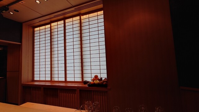 シェフにエスカレーターで3階まで案内されると、お客さんが外苑西通りに向かうように6席にカウンターがあり、カウンターの内側ではお茶担当の方がお茶の用意をしてます。そして、左側の壁側に厨房という造り。