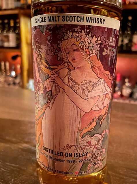 先ずはジントニックですが、2杯目はスリーリバーズオリジナル 新シリーズ「四季」 第2弾 「春」アイラシングルモルト 1998 22年熟成で、ラベルはいつも通りのミュシャが描いた作品です。