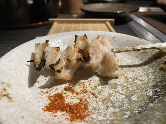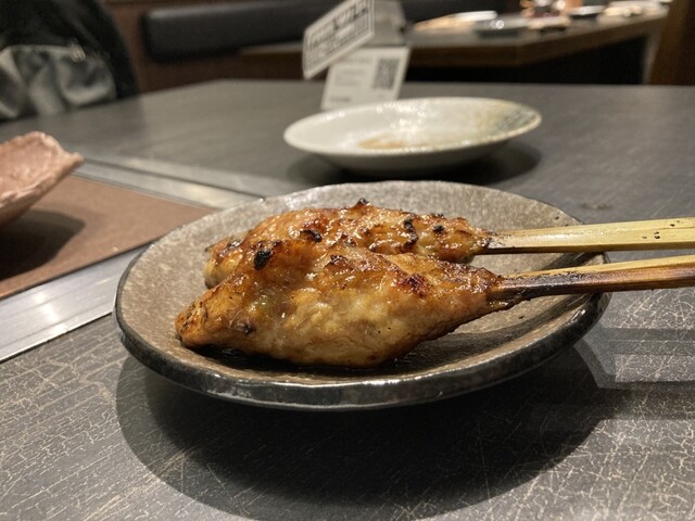 最初に来た鶏皮塩は炭火の香りが1番に口の中に飛び込んでくる。塩味が鶏の旨みを引き立たせじゅわーっと良質な脂が口に広がる、上手いわ。