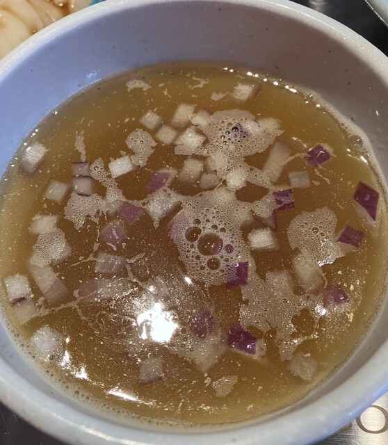 つけ汁は鶏と魚介類だと思いますが、やや魚介感が強めなスープ。麺に絡んだ昆布水と相まってこれまたずっと啜れます。