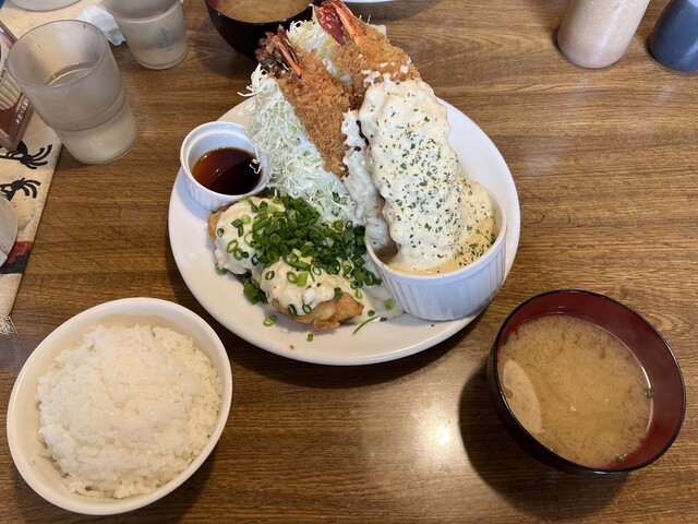 エビフライセットを頼む。ライスとキャベツは、それぞれ小中大とのことで、中に。