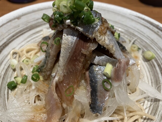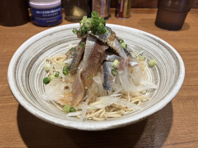 まずはいわしそばが着膳し和え玉ですが見た目も美味しそうです!頂くと生いわしがのっていて臭みもなくいわし好きにはたまらない一杯で途中からレモン酢とホワイトペッパーで味変をし美味しく頂きました!
