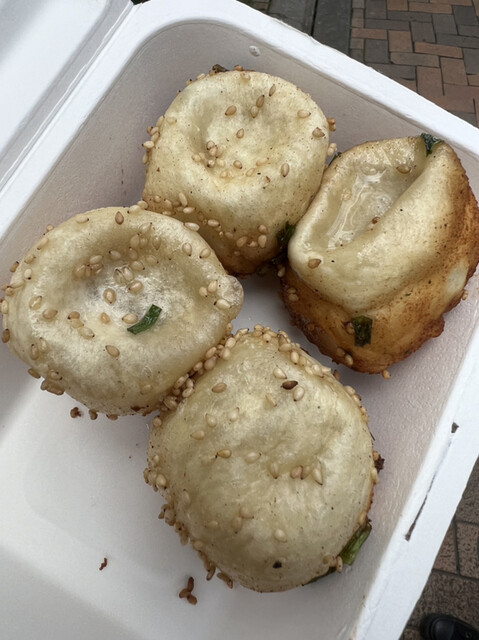 一つ一つ手作りで生地もモッチモチで分厚くて底面はカリッと焼いてあって中は肉汁ジューシーで火傷注意!