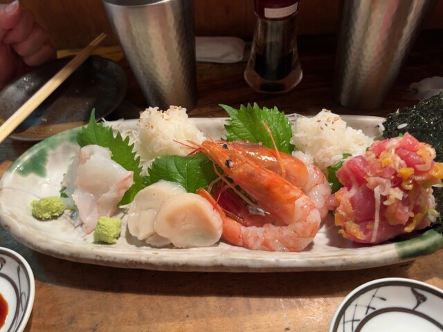 まずは刺盛り。一人前で十分と言われ、次々と盛られていく。クエに中トロにクジラにヒラス、、、...