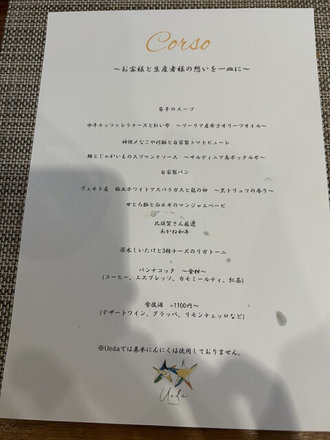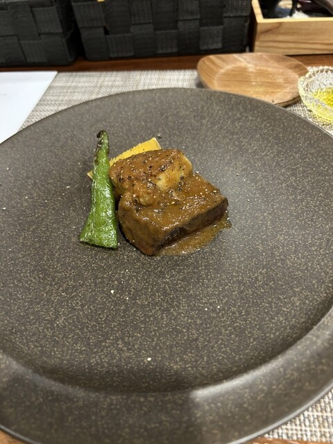 シチリア料理、広島世良のネギ、レンズ豆、マルサラ酒のソースで頂いた。今回一番びっくりしたのはお肉。ただ単に焼いただけのものかと思ったが、流石ただで終わらないのが、uedaさん。今回は煮込!柔らかくて肉がホロホロ。感動した。最後は〆のホワイトマッシュルームとマルサラチーズの香りが良かった。お客さんは8割方が地元のお客さんで、何時も賑わっており、人気の高さが分かる。はっきり言ってこの価格で、採算取れているのか心配。また来ます。ごちそうさまでした。
