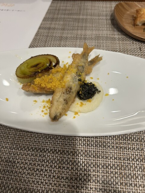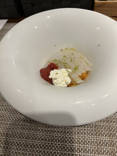 先ずはアサヒビールでお疲れ様。初っ端は栗南瓜スープ甘くて美味しい。地元松山産紋甲烏賊と輝太郎紋甲烏賊と鳥取県ブランド柿輝太郎、自家製チーズ、トマトの付け合わせ。和食か?と思わせる一品。子持ち鮎芽セロリソースキャビア添え、そして上な唐墨が振り掛けられていた。1ケ月低温で熟成した栗とトリフクワトロツォルマッジョ。
