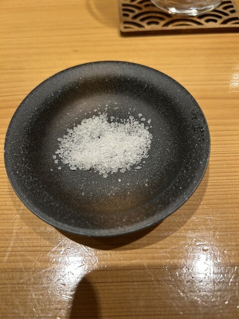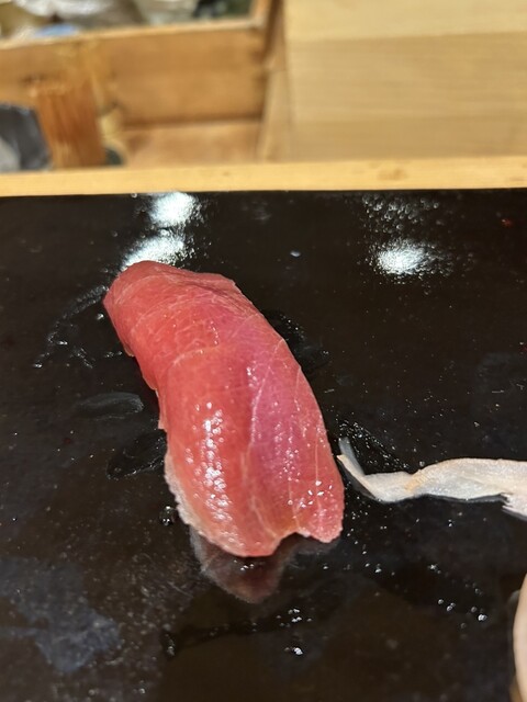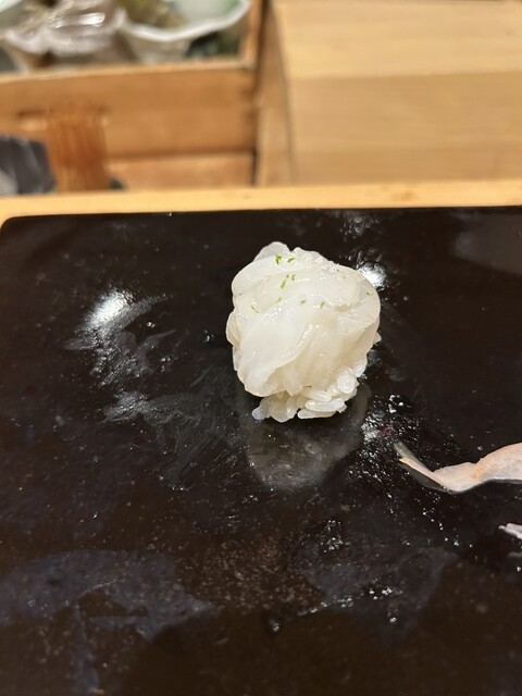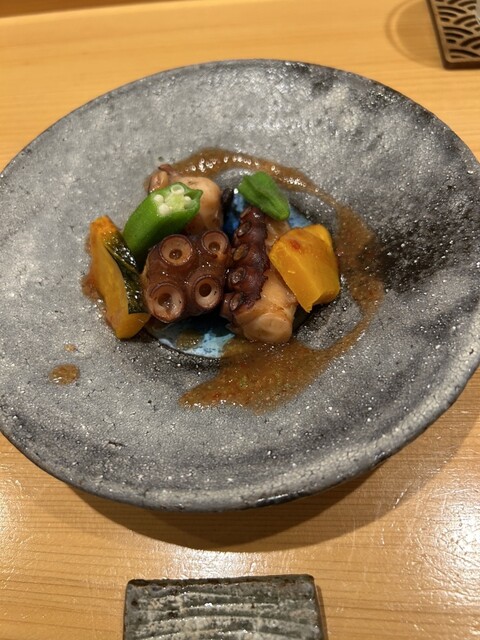 雨足が強く開店18:30より10分前にお店に訪問。用意にもう少し時間が掛かるので、別室に通され、待機。そして10分後カウンターに通された。先付けは、内子産モッツァレラチーズを和風出汁に漬け起きしたもの。屋久島のうなぎ握り、松山産長ナス鮨、車海老にチーズと酒粕を合わせてもの、葉わさびと粕漬、いわしと地元砥部七折の梅ソース、最後は高知産とうもろこし、生姜をあえた天麩羅。刺身は松山産タコを酒で軽く煮た。三河産平貝炙り。オナガダイ、鯛マツカワ。どれも長期間の熟成をしてる。岐阜産鮎の一夜干し、長野産マツタケの天麩羅、長崎産穴子と梅肉を大葉での包み揚げ、淡路島産天然車海老の天麩羅、身がしっかりしていた。帆立に海苔を巻いた天麩羅。そして寿司、青森産ヒラメの縁側、6キロあるらしい。コハダ、トキシラズ、北条産のシメサバ、塩竈赤身、2週間近くねかしたそうなので、柔らかい。長崎産穴子、ウニ、和歌山の赤海老、アオリイカ、ノドグロを炭で直に炙った。大トロを2週間近く寝かせたもので、脂が中和され、優しい味であった。今回のお味噌汁は、刺身で出てきたヒラメとオナガダイで出汁をとったもの。デザートはスイカ、松山産シャインマスカット、岡山県産梨。これが凄く甘かった。今回もプロの仕事を堪能させて頂きました。今年8月で8周年だそうで、長く店を運営できる大将の人柄に納得し、ごちそうさまでした。