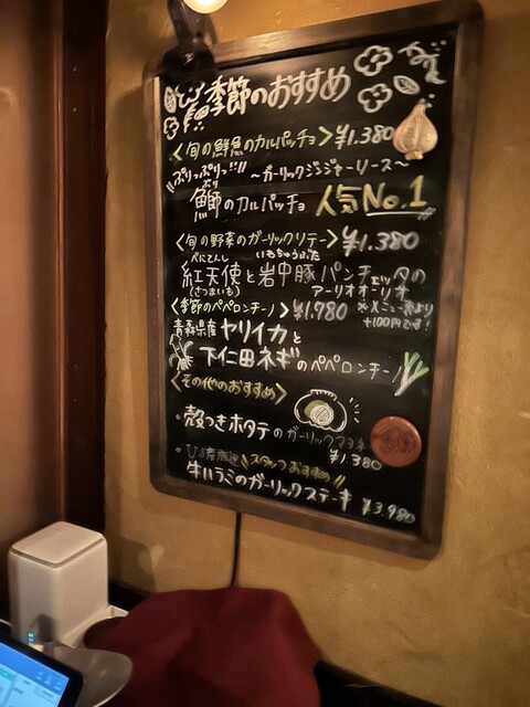 肉料理は2種類選べる事ができ、ハラミとハツをチョイス。炭水化物系は、パスタ、ピザから1種類チョイス、ペペロンチーノを選択。デザートも3種類から選べるが、こちらのお店なのでにんにくにこだわり、寒いけど、にんにくアイスにした。