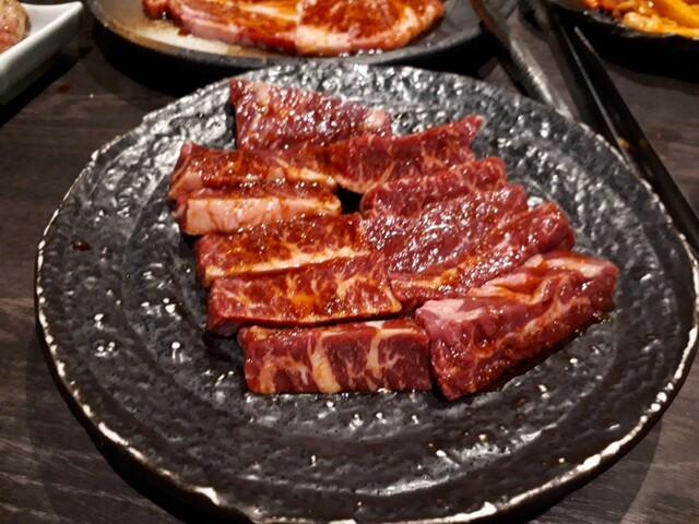 今回は夫の誕生日祝に家族で美味しい肉を食べにやってきました。土曜日の夜、もちろん予約して。今まで団体できたことは何回かありましたが、個人的に来たのは初めて。席に通されるとすでにカンカンにいこった炭の七輪が置かれてました。それをみただけでテンションが上がります。ご注文はお決まりですか?と聞かれたけどの注文の仕方がわからなかったのでホールの女性に尋ねます。塩とタレどちらが良いですか?…なんでも特上のお肉たちは塩を選んでワサビで食べる人が多く、普通のお肉はタレで食べる人が多いらしい。また1人前の量も気になるところ。それも尋ねると大体5切れくらいですとのこと。メニューによって例えばタンやぶりすけなんかは薄切りになるので数は変わります。うん。よくわかった!店員さんはみんな感じが良くて話しやすいのでわからない事はまず聴いてみると良いと思います。さて、美味しい肉に飢えてた私たち家族は特選ロース、特上カルビ、ミスジ、三角を1人前ずつ全部塩で注文。それから忘れちゃいけない塩タンは2人前注文。飲み物はもちろん生ビールで!まず生ビールで乾杯すると塩タンが運ばれてきました。網の上に乗せるとあっという間に美味しそうに焼けて行きます。焼き加減が難しいですが肉厚ぷりぷりでとても美味。レモンも厚切りでおいてくれていてたっぷりかけられます。次は特選ロースと三角、特選カルビとミスジが石の平なお皿に乗って運ばれてきます。隅っこにはこんもり盛った本わさび。塩タンでウォーミングアップ済ませ、よりいっそうお肉を欲する私達に見事な霜降りのお肉達が満を持しての登場です。はやる気持ちを抑えて霜降り肉たちを徐ろに網に乗せると音を立てて脂が溶け出します。焼きすぎ無いように注意しながら目を離さずお肉のお守り。お待ちかねの程よく焼けたお肉はワサビをつけてひとくちで。うーん!柔らかくジューシーでワサビの甘みと肉の旨味が程よく絡んで…この上ない幸せの瞬間!霜降りのお肉たちは思ったより食べごたえあり家族3人で四種類1人前ずつでちょうど良い分量。他に普通のお肉のロース、カルビ、ハラミをタレで1人前ずつ頼みました。タレも濃すぎず普通のお肉でも実に美味しい。締めはクッパと玉子スープ。これもクセのない美味しさでした。1人前をシェアできるように言わなくても器を3つ持ってきてくれるので初心者にはそういう心遣いも嬉しい。すっかり平らげもうひとくちも入らないくらいお腹は満腹。そして気になるお会計は1人ほぼ5000円なり。とびっきり美味しいお肉と居心地の良い雰囲気。そして何よりリーズナブルなお会計(笑)席を立つと通路には有名人の来店記念写真がずらりと。初めて来た家族はそれにもテンションあげておりました。最後に店長が外までお見送り来てくれてその気遣いがまた嬉しかった。やはり遠くからでも来たかいがありました!やっぱりいつ来てもハズレなし!家族も大満足で私も嬉しくなりました。来年の誕生日もまた家族で来ますね。美味しいお肉をありがとう(^^)/