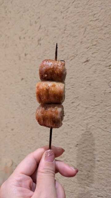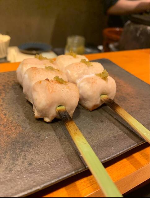 ささみの串焼きはふんわりと焼かれたささみの上に柚子胡椒がのせてあり、味のバランスが絶妙。火入れも素晴らしく、ささみとは思えない柔らかさです。
